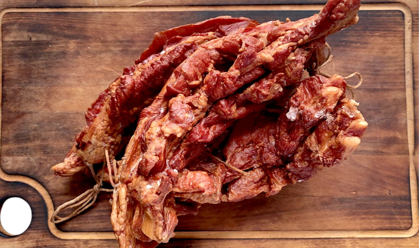 Kości chrząstki wędzone to wyjątkowy produkt pochodzenia zwierzęcego, przygotowany w tradycyjny sposób przez powolne wędzenie w naturalnym dymie drzewnym. Charakteryzują się intensywnym aromatem, głębokim smakiem i wysoką zawartością żelatyny oraz kolagenu.