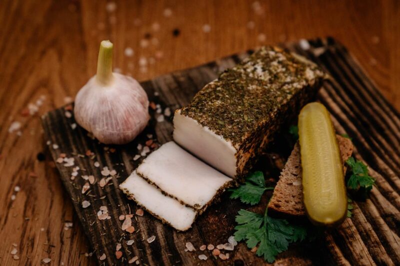 Wyselekcjonowany płat grubej słoniny, obsypany solą kamienną, leżakowany. Dzięki temu zyskuje wyjątkowy smak oraz miękkość. Z dodatkiem aromatycznych ziół, pieprzu czarnego i czosnku.
